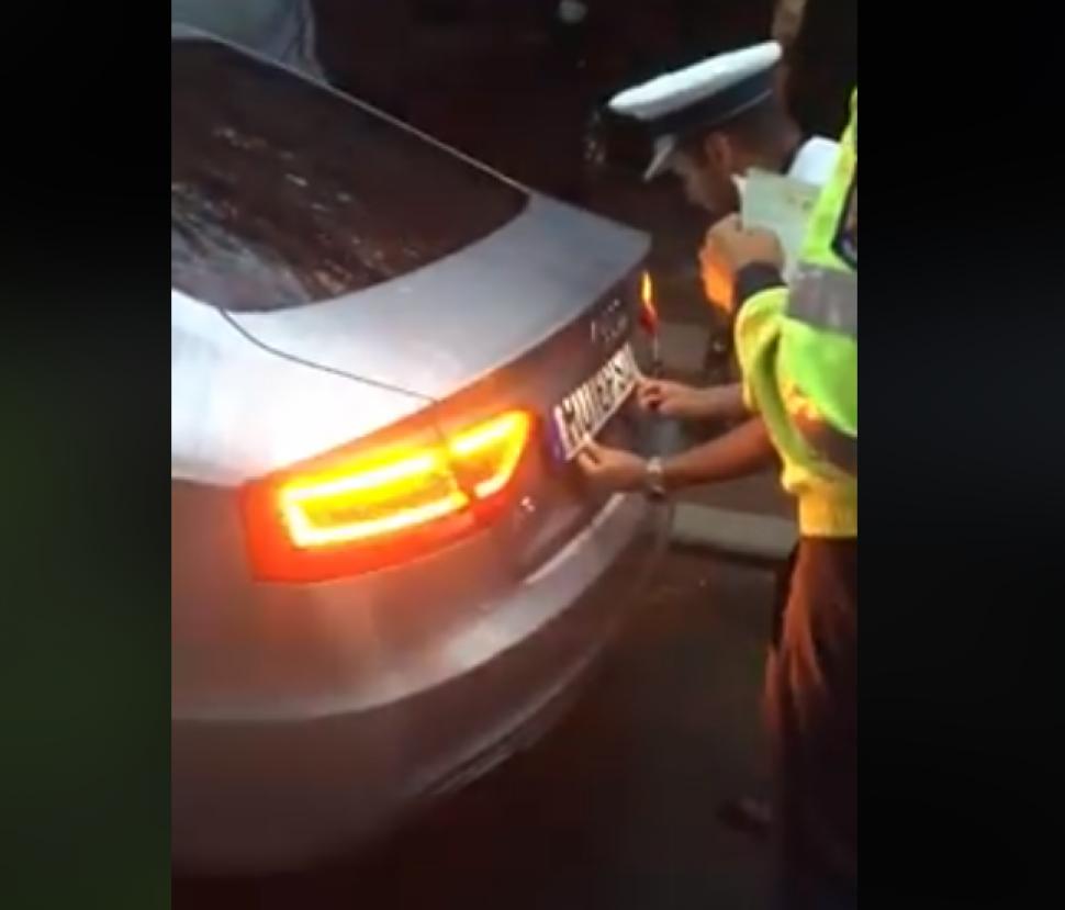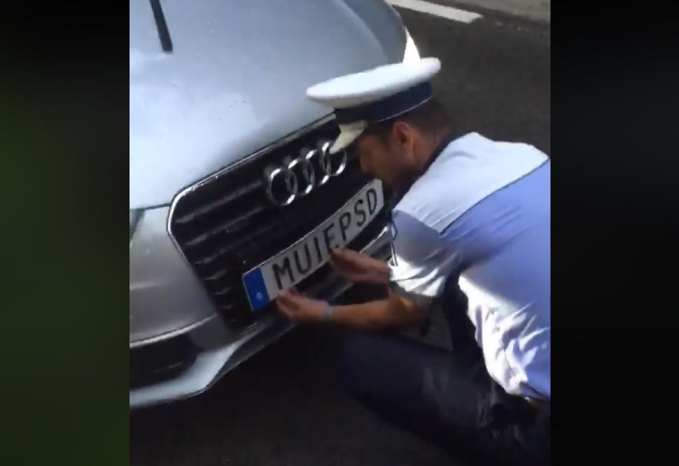 Răzvan Ștefănescu, șoferul autoturismului Audi cu numerele MUIE PSD, a postat pe Youtube un clip în care arată momentul în care polițiștii de la briada rutieră București au dat jos plăcuțele de înmatriculare MUIE PSD.