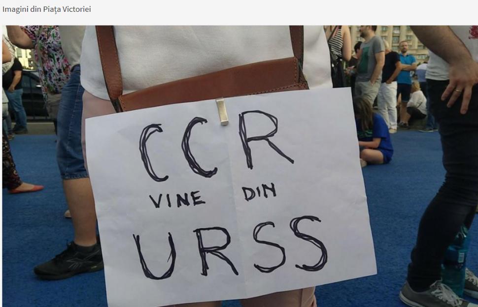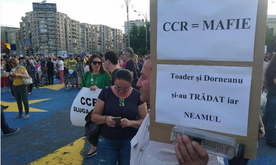 Oamenii scandează "CCR, sluga PSD!" și "Jos Tăriceanu! Dragnea, Toader și Dorneanu!".