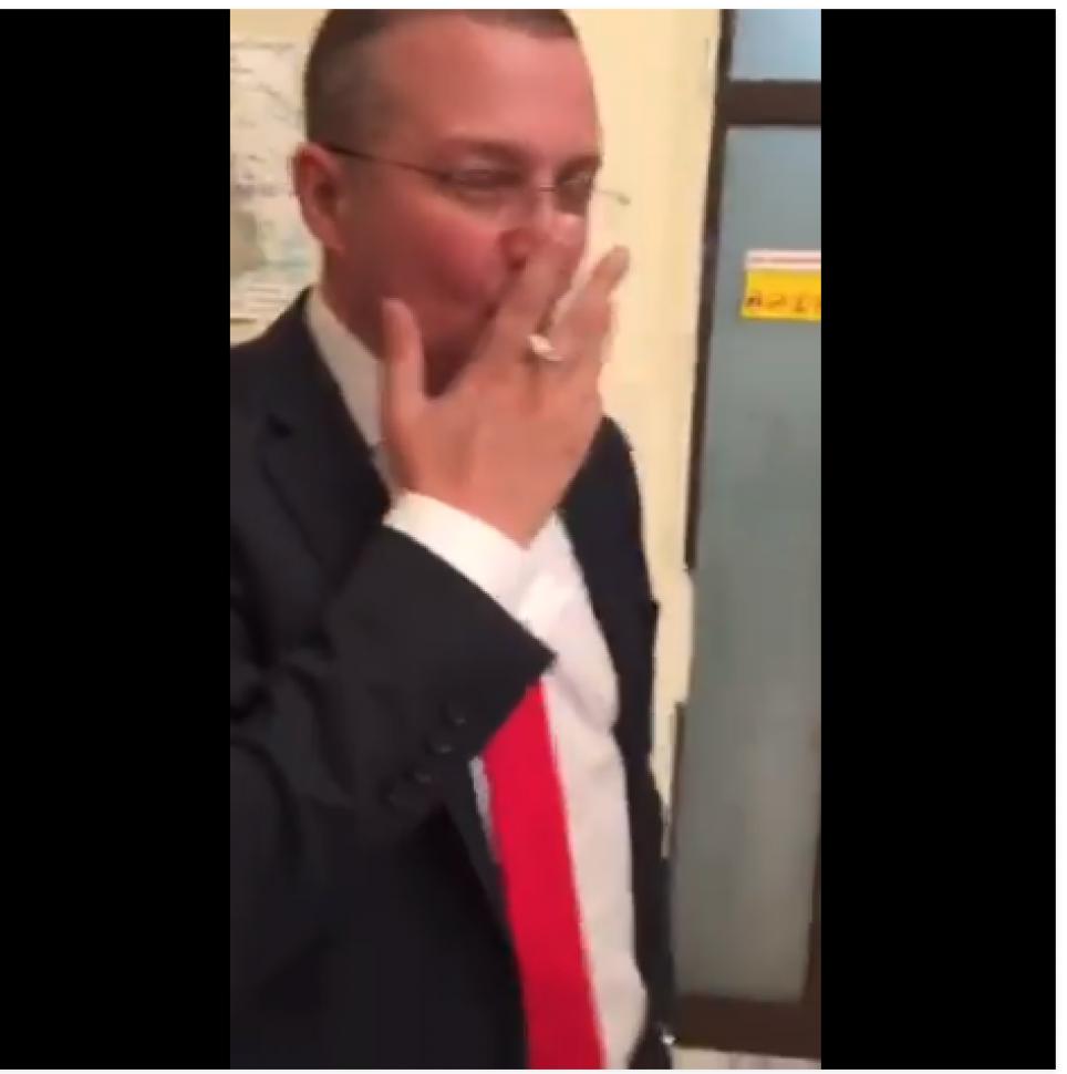 Prefectul PSD de Ilfov, Adrian Petcu, a fost filmat fumând într-o instituție publică de față cu jandarmii. Care, ca niște lași, deh, de față cu stăpânul, nu-l amendează pe bou! Întrebat de un cetățean dacă este legal să fumeze, prefectul a dat un raspuns, șmecher, că fumează pentru că îl doare capul din cauza celui care îl filmează...