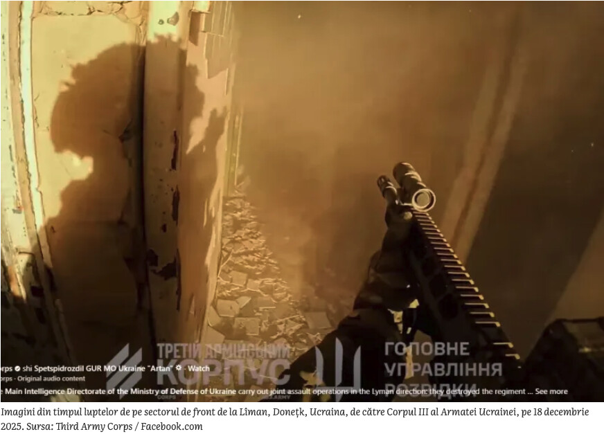 Forțele ucrainene au lansat un contraatac în apropiere de orașul Lîman, din regiunea Donetsk, eliminând ceea ce acestea au descris ca fiind un întreg regiment rus – o unitate care poate număra aproximativ 2.000 de soldați, cel puțin pe hârtie – și afirmând că și-au îmbunătățit pozițiile, a anunțat joi, 18 decembrie, Corpul III al Armatei Ucrainei, potrivit The Kyiv Independent.