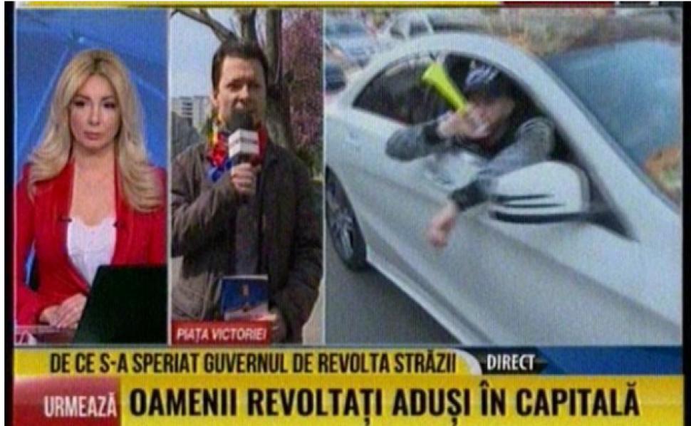 „Oameni revoltați au fost aduși în Capitală„, titra vineri România TV, în jurul prânzului. „Mobilizare totală pentru cel mai mare protest„, urma pe ecran. „Cine pregătește bătăi și atacuri la proteste„, era o altă burtieră. Plus „Protestatarii vor fi verificați până la piele„.În timpul acestor burtiere, pe ecran rulau imagini cu oameni protestând. Pe ecran scria DIRECT când, în fapt, erau imagini de zilele trecute.„Jandarmi doborâți în piață, scene violente”