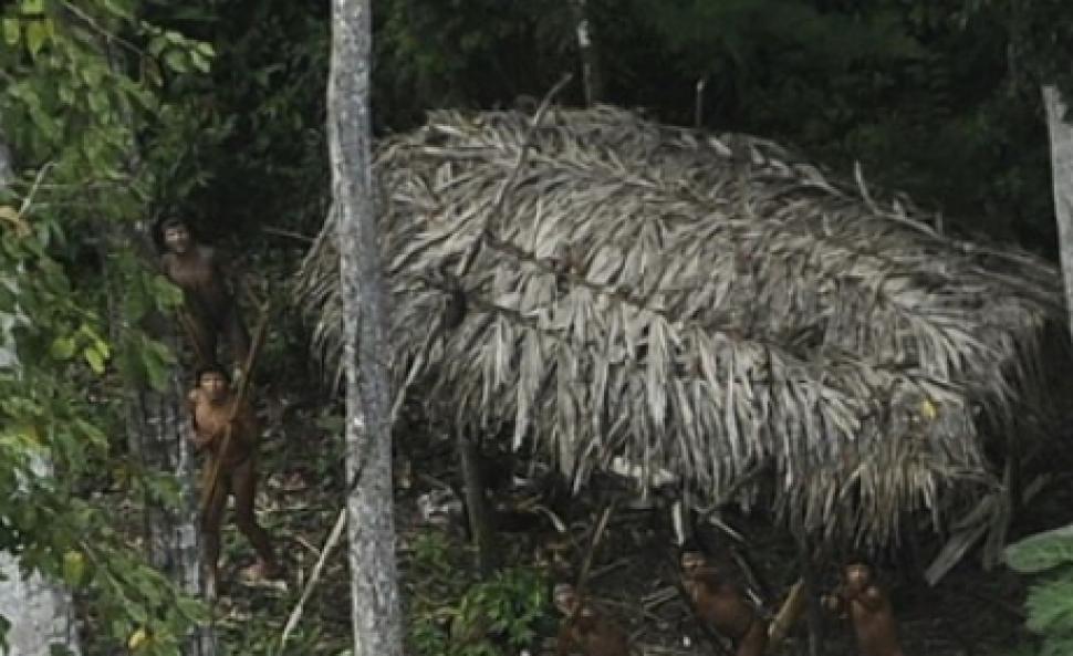 Acesti oameni care traiesc in regiunea amazoniana nu au fost contactati pana acum. Ei au fost speriati, agitand sulitele, la aparitia avionului deasupra padurii.